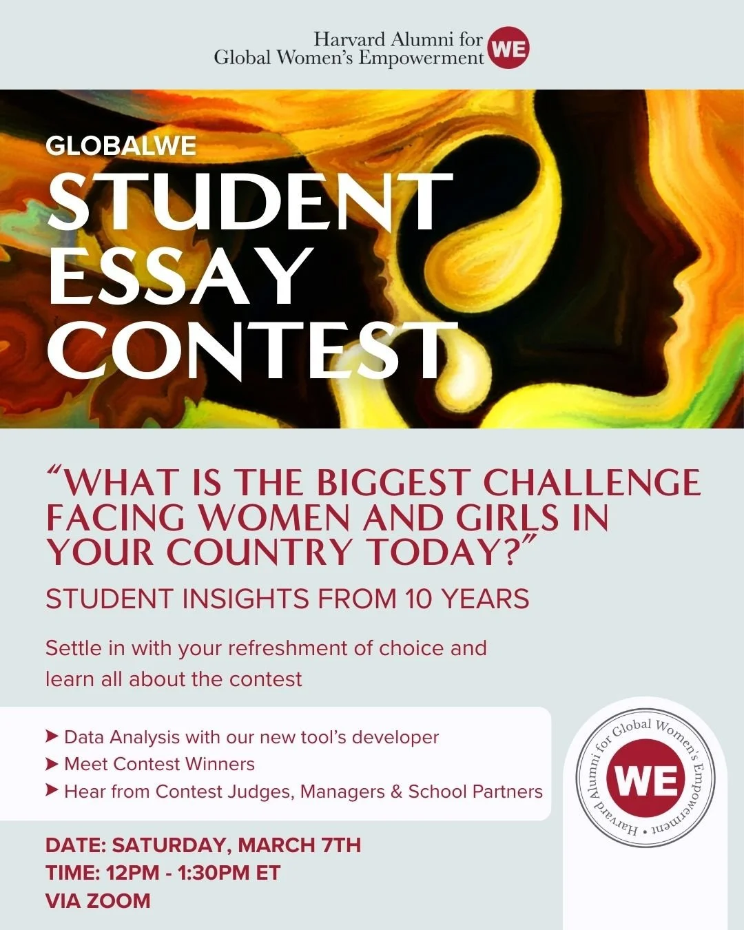 We are dedicated to the empowerment of women through education, dialogue and connection among individuals working for women's rights and freedoms worldwide. Harvard GlobalWE does not advocate a specific ideology or political or cultural agenda. We are an inclusive organization with membership open to and comprising all genders.